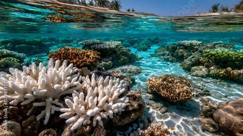 Fototapeta premium Vibrant underwater coral reef is affected by bleaching, showcasing mix of healthy and bleached corals under clear blue water. sunlight creates shimmering effect on ocean floor