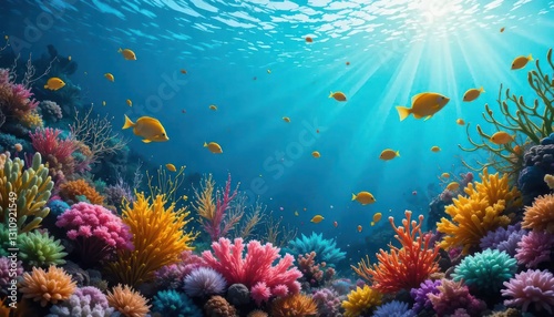 Naklejka premium Vibrant Underwater Coral Reef Paradise: A Colorful Ocean Scene