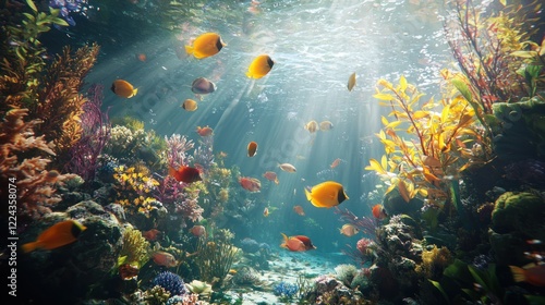 Naklejka premium Vibrant Underwater Coral Reef Paradise: Sunbeams Illuminate a Thriving Ecosystem