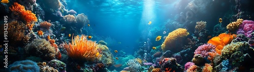 Fototapeta premium Vibrant Underwater Coral Reef Scene with Colorful Fish and Sunlight Photo