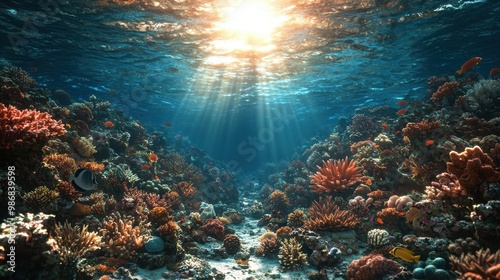 Fototapeta premium Vibrant Underwater Coral Reef Scene with Sunlight Rays and Tropical Fish