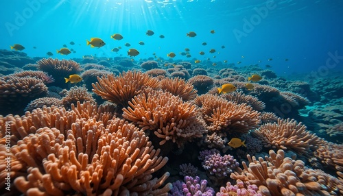 Obraz premium Vibrant Underwater Coral Reef Scene with Yellow Fish Swimming