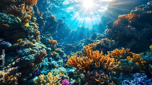 Naklejka premium Vibrant underwater coral reef teeming with colorful marine life and sunlit rays piercing the ocean.