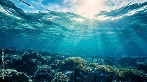Fototapeta premium Vibrant underwater coral reef thriving under sunlight during World Animal Day...