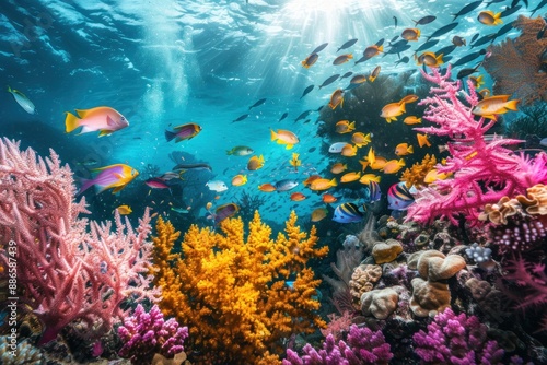 Naklejka premium Vibrant Underwater Coral Reef with Colorful Fish.