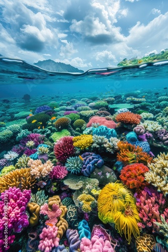 Naklejka premium Vibrant Underwater Coral Reef with Diverse Marine Life Under Blue Sky