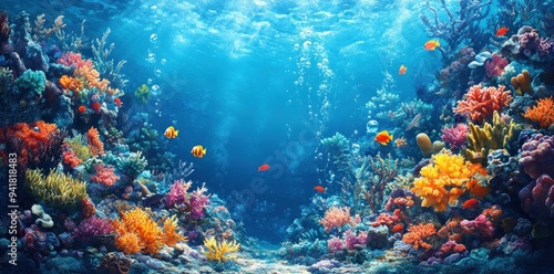 © Npicture, Naklejka premium Vibrant Underwater Coral Reef with Fish and Bubbles