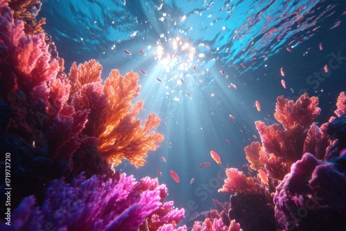 Fototapeta premium Vibrant underwater coral reef with sunlight