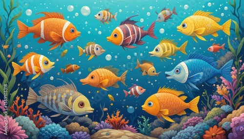 Naklejka premium Vibrant Underwater Illustration Colorful Fish, Coral Reef, and Seaweed