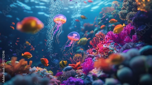 Naklejka premium Vibrant Underwater Paradise: Jellies and Coral Reef