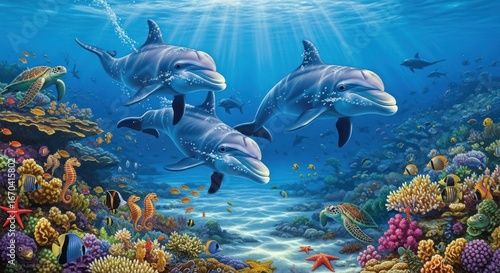 Fototapeta premium Vibrant Underwater Paradise: Playful Dolphins, Sea Turtles, and Colorful Reef...