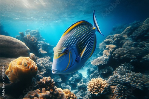 Fototapeta premium Vibrant Underwater Scene: A colorful fish swims gracefully in a sunlit coral reef, capturing the beauty of marine life.