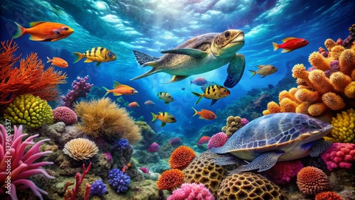 Naklejka premium Vibrant Underwater Scene Featuring Colorful Fish and Majestic Sea Turtles...
