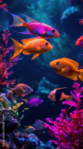 Fototapeta premium Vibrant underwater scene featuring colorful fish in a lush aquarium garden.