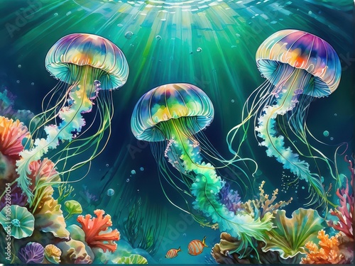 © darion, Fototapeta premium Vibrant underwater scene featuring colorful jellyfish and coral.