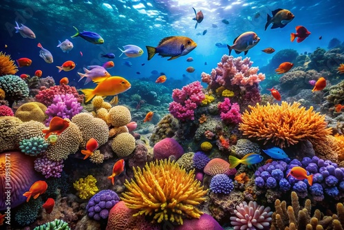 Naklejka premium Vibrant Underwater Scene Featuring Colorful Marine Life and Coral Reefs in...