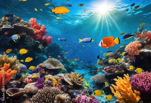Fototapeta premium vibrant underwater scene featuring diverse marine fauna colorful coral reefs variety fish species lively aquatic environment, creatures, life, catalog