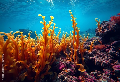 Fototapeta premium Vibrant underwater scene, lush seaweed, ocean floor details, coral, plants