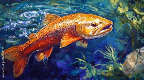 Fototapeta premium Vibrant underwater scene of a swimming trout in colorful natural habitat