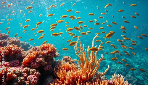 Fototapeta premium Vibrant Underwater Scene of Coral Reef and School of Fish Swimming in Crystal...