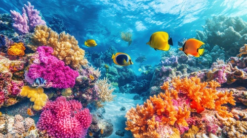 © possawat, Naklejka premium Vibrant Underwater Scene of the Great Barrier Reef Teeming with Life
