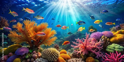 Fototapeta premium Vibrant underwater scene showcasing a diverse array of colorful fish swimming amidst a lush coral reef, bathed in sunlight