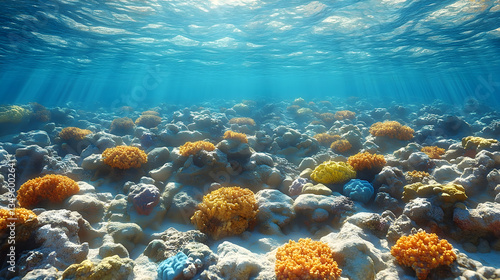 Naklejka premium Vibrant underwater scene showcasing a diverse coral reef ecosystem bathed in sunlight. Various coral formations and marine life are visible on the ocean floor
