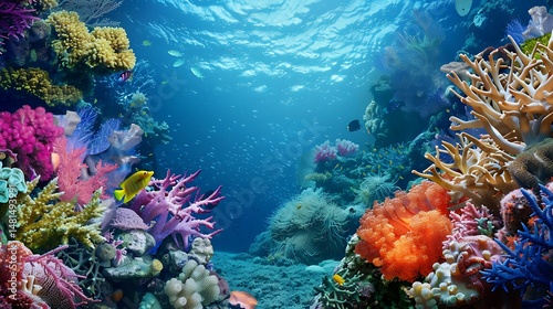 © atar, Naklejka premium Vibrant Underwater Scene Showcasing Colorful Coral Reefs and Diverse Marine Life