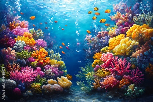 Naklejka premium Vibrant underwater scene with colorful coral reefs and fish.