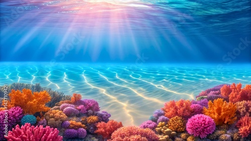 Naklejka premium Vibrant Underwater Scene with Colorful Coral Reefs and Sunlight Streaming...
