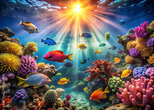 Obraz premium Vibrant Underwater Scene with Colorful Fish and Coral Reef
