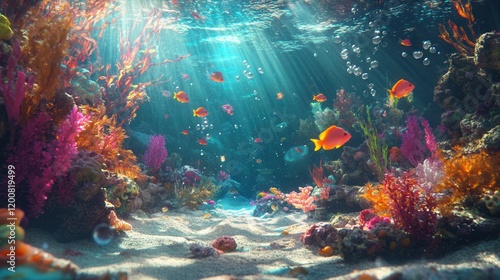 Naklejka premium Vibrant Underwater Scene with Colorful Fish and Coral Reef