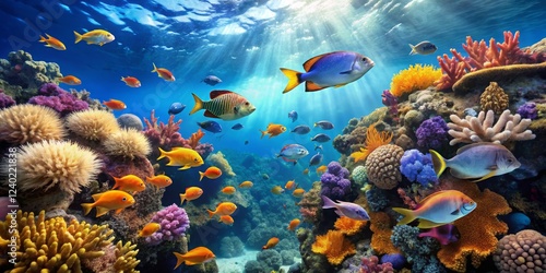 © kanda, Naklejka premium Vibrant Underwater Scene with Colorful Fish and Coral Reefs