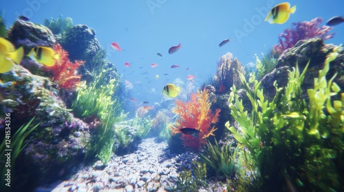 Naklejka premium Vibrant Underwater Scene with Colorful Fish and Lush Coral Reef