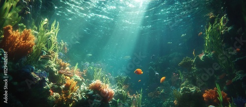 Naklejka premium Vibrant underwater scene with coral reef, diverse fish, and sunbeams...