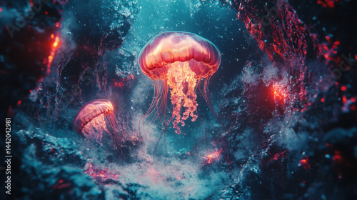 Naklejka premium Vibrant underwater scene with glowing jellyfish floating amidst luminous...