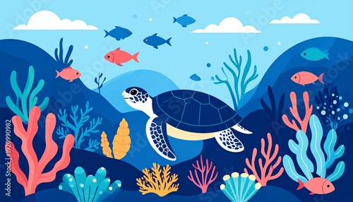 Obraz premium Vibrant underwater scene with sea turtle and colorful coral