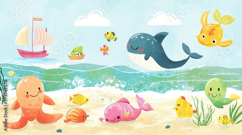Naklejka premium Vibrant Underwater Scene with Whimsical Marine Creatures and Vessels