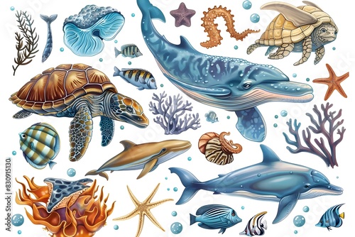 Naklejka premium Vibrant Underwater Scenery with Diverse Marine Life and Coral Reef Formations