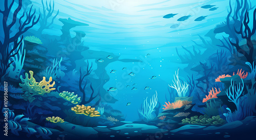 © Smallde, Fototapeta premium Vibrant Underwater Seascape: An Enchanting Illustration of a Coral Reef Ecosystem with Diverse Marine Life, Showcasing the Beauty and Serenity of the Ocean Depths