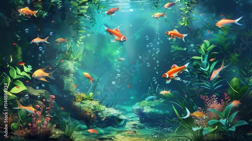 Fototapeta premium Vibrant underwater world filled with colorful aquarium fish swimming among...