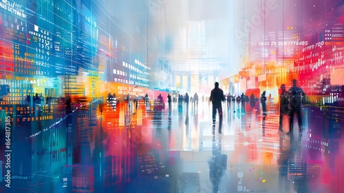 Obraz premium Vibrant urban abstract digital cityscape with silhouettes of people, dynamic...