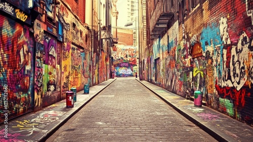 Fototapeta premium Vibrant Urban Alleyway, a lively scene showcasing colorful murals and...