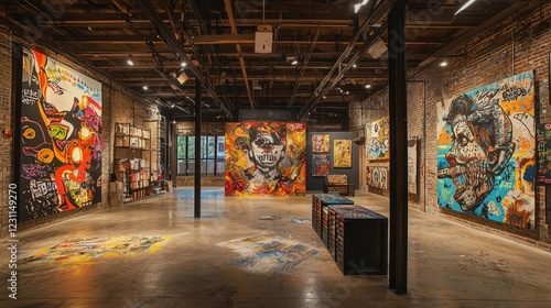 Naklejka premium Vibrant Urban Art Gallery with Colorful Street Art Murals Displayed