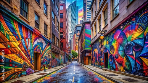 Fototapeta premium Vibrant urban landscape featuring a narrow alleyway flanked by towering buildings, transformed into a kaleidoscope of colors by dynamic, eclectic, and abstract graffiti masterpieces.