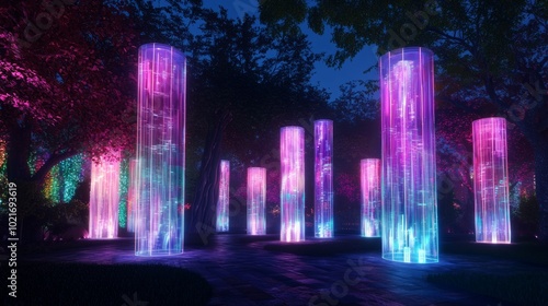 Obraz premium Vibrant Urban Park Light Installations with Interactive Towers and Ambient Music Pulse