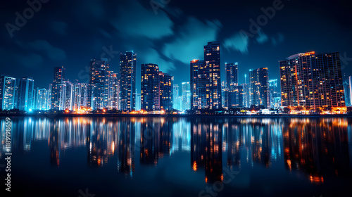 Fototapeta premium Vibrant urban skyline at night, illuminated buildings reflecting in the...