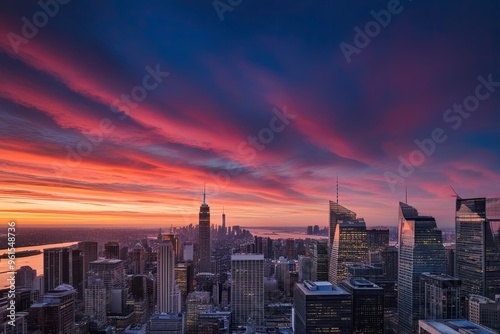 © Michael, Obraz premium Vibrant Urban Skyline at Sunset: Panoramic View and Textured Silhouettes