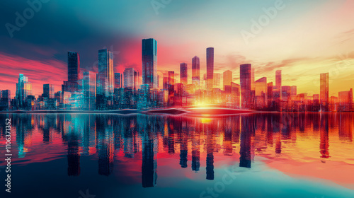 Fototapeta premium Vibrant urban skyline at sunset reflecting over water