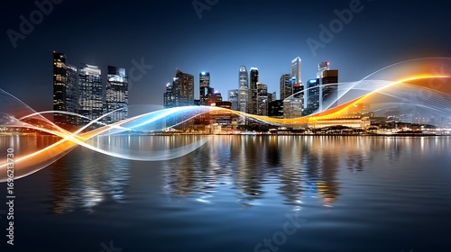 © lekky, Obraz premium Vibrant Urban Skyline Reflected on Water with Colorful Light Trails at Night
